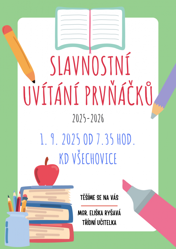 Slavnostní uvítání prvňáčků a jejich rodičů představiteli školy, spádových obcí a mikroregionu proběhne i v letošním školním roce opět v Kulturním domě ve Všechovicích v pondělí 1.9.2025 od 7.35 hod.